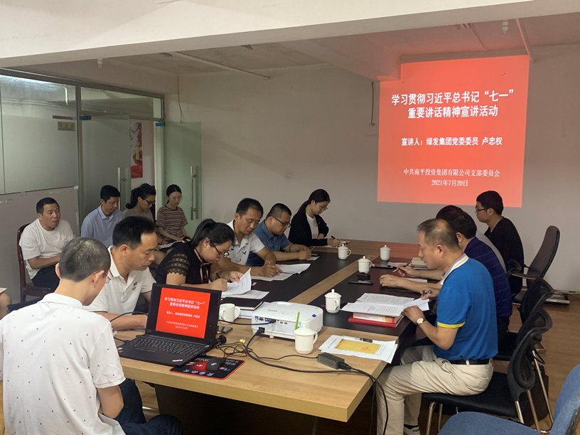 第一階段綠發(fā)集團黨委委員盧忠權(quán)同志進行習近平總書記“七一”重要講話精神宣講,幫助大家全面理解、準確把握重要講話精神,引導大家深刻領會習近平總書記“七一”重要講話精神的核心要義和重要內(nèi)涵,緊密聯(lián)系落實“國企三年改革行動方案”,推進國資國企改革再上新臺階。支部全體黨員及產(chǎn)權(quán)、科特派、投資集團全體員工聆聽宣講活動。
