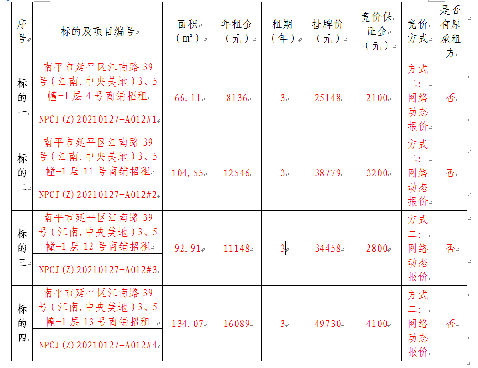 租賃標的名稱 | 南平市延平區(qū)江南路39號(江南.中央美地)3、5幢-1層4號商鋪,南平市延平區(qū)江南路39號(江南.中央美地)3、5幢-1層11號商鋪,南平市延平區(qū)江南路39號(江南.中央美地)3、5幢-1層12號商鋪,南平市延平區(qū)江南路39號(江南.中央美地)3、5幢-1層13號商鋪招租 | | |||||||||||||||||