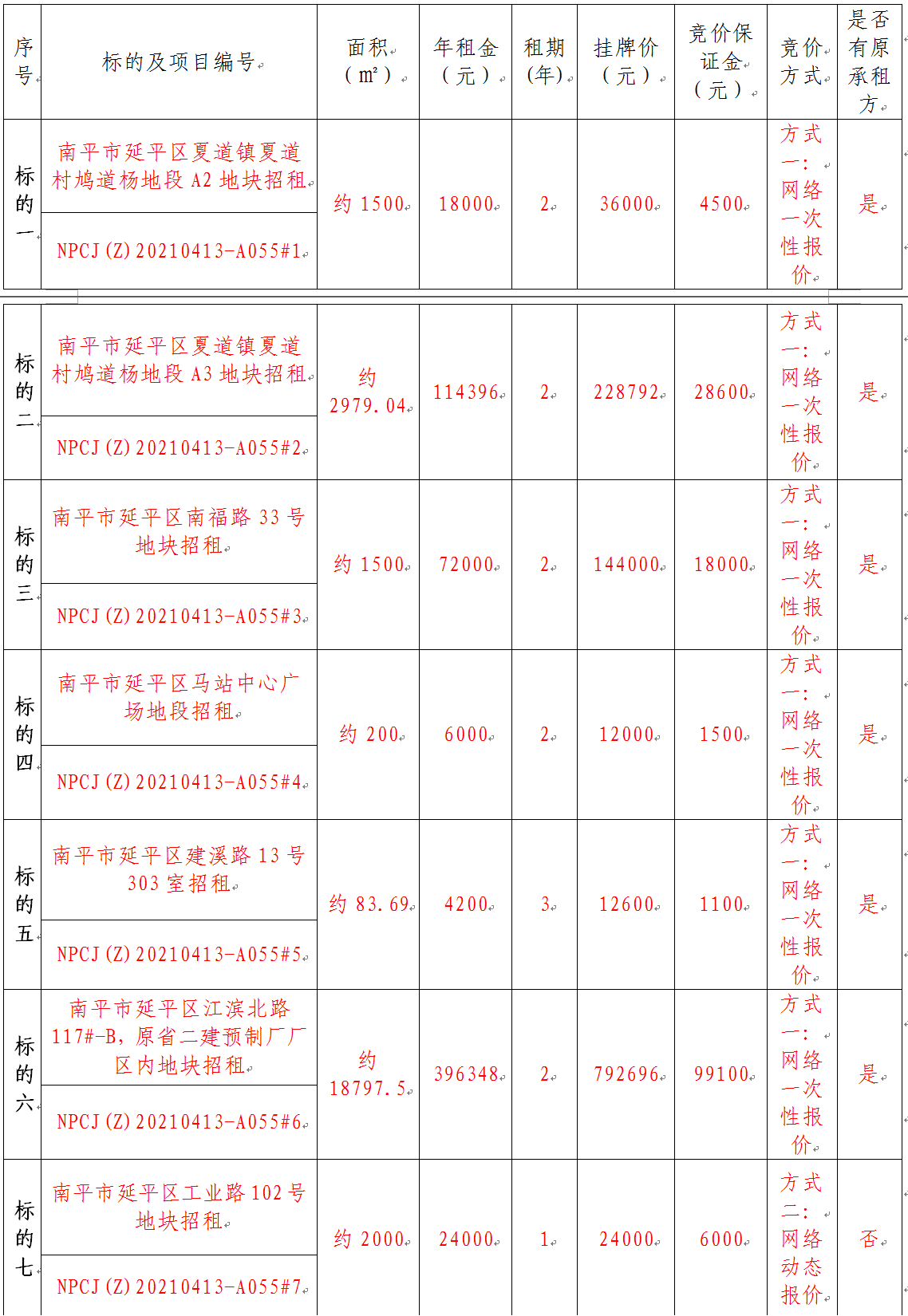 1.合同履約保證金:3個月租金(保證金不計息)。 2.特別提示: 2.1租賃標的四僅為地塊使用權租賃,不含地塊所附著建筑物。承租方需自行與原承租戶協(xié)商相關事宜,如協(xié)商不成,原承租戶有權拆除其出資建設的所有附著物,并將地塊恢復原貌(相關拆除費用由原承租戶自行承擔); 2.2租賃標的五僅為房屋使用權租賃,不含房屋所附著的裝潢裝修、家具家電等,上述附著物歸原承租戶所有,承租方需自行與原承租戶協(xié)商相關事宜,如協(xié)商不成,原承租戶有權拆除其出資建設的所有附著物,并將房產恢復原貌(相關拆除費用由原承租戶自行承擔); 2.3租賃標的六僅為地塊使用權租賃,不含地塊所附著建筑物,承租方需自行與原承租戶協(xié)商地塊內三通一平道路支護、水電增容及建筑物等相關事宜; 2.4租賃標的七承租方需自行辦理水、電、網絡等,費用由承租方自行承擔。 3.承租方不得在地塊內擅自搭建,不得改變承租用途,不得擅自以任何形式轉租。 4.承租方對租賃物業(yè)進行改造裝修或搭建臨時建筑物的,須先征得出租方書面同意后方可施工,費用及相關用地行業(yè)報批的手續(xù)由承租方自理。租賃期滿或解除合同的,依附于房屋的裝修無償歸出租方所有,承租方不得拆除及提出任何補償。 5.租賃期間,若因城市規(guī)劃、政府行為或社會公共利益需要,租賃合同終止履行;承租方自收到出租方書面通知后,應于60天內將租賃標的物無條件交還出租方;承租方在該地塊投入的一切經營成本不予退還。 6.租賃標的一至標的四及標的六至標的七承租方除正常在地塊下經營外,還需對該租賃標的地塊隸屬的土地證范圍內(其中租賃標的一至標的二的土地權證號:南國用(2016)第000513號;租賃標的三土地權證號:閩(2019)南平市不動產權第0009870號;租賃標的六土地權證號:南國用(2012)第000326號;租賃標的七土地權證號:南國用(2015)第004452號)的地塊進行看護,不得出現(xiàn)違建、蠶食等侵占現(xiàn)象。 7.租賃期滿后,承租方如有意向繼續(xù)承租,則該承租方在同等條件上享有優(yōu)先承租權。 |