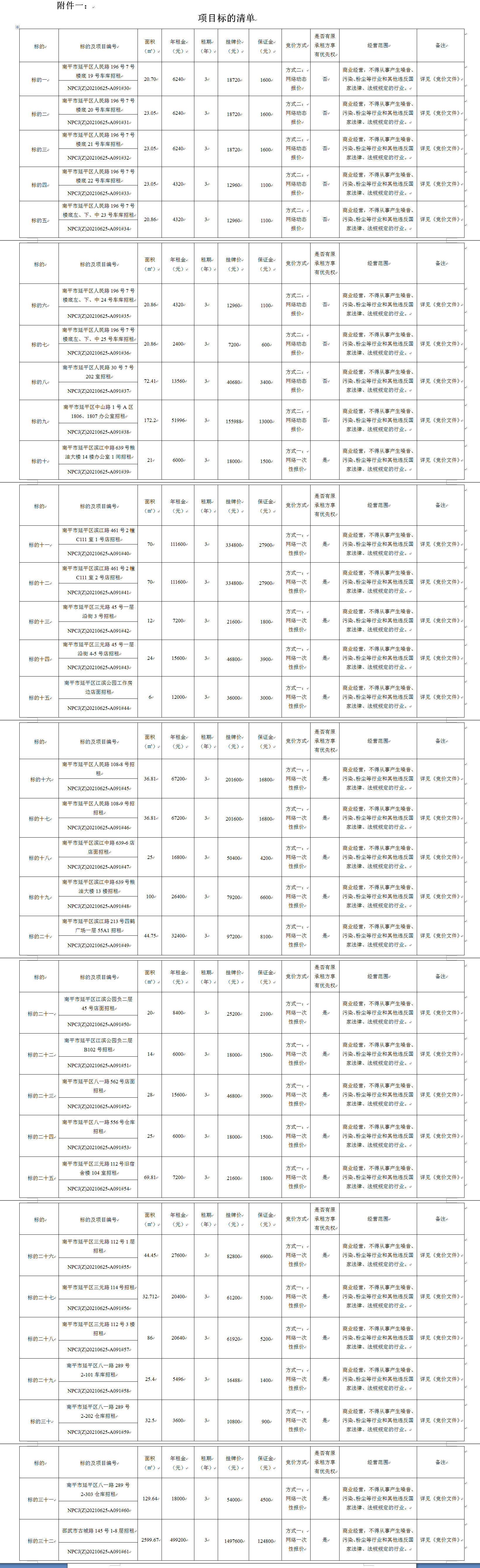 1.租賃用途:詳見(jiàn)附件一。 2.于競(jìng)買人計(jì)算面積單價(jià),網(wǎng)絡(luò)競(jìng)價(jià)以年租金底價(jià)進(jìn)行報(bào)價(jià),最終成交總額以年租金的最高報(bào)價(jià)×租賃期限。 3.本次競(jìng)價(jià)標(biāo)的十至標(biāo)的三十二屬在同等條件下原承租方享有優(yōu)先承租權(quán)。 4.裝修情況:以實(shí)際現(xiàn)場(chǎng)看樣為準(zhǔn)。 5.原租賃合同到期日: 5.1租賃標(biāo)的標(biāo)的十至標(biāo)的十五、標(biāo)的二十五至標(biāo)的二十七及標(biāo)的二十九至三十原租賃合同于2021年5月31日到期; 5.2租賃標(biāo)的十六至標(biāo)的二十四及標(biāo)的三十二原租賃合同于2021年6月30日到期; 5.3租賃標(biāo)的三十一原租賃合同于2021年6月19日到期; 5.4租賃標(biāo)的二十八原租賃合同于2021年4月30日到期。 6.起租時(shí)間:若原承租人未報(bào)名參加競(jìng)租或報(bào)名參加競(jìng)租未取得標(biāo)的,原承租人應(yīng)于原租賃合同到期次日起7天內(nèi)將承租房產(chǎn)退還出租方,若原承租人報(bào)名參加競(jìng)租取得標(biāo)的的,起租時(shí)間自成交公示期滿次日起計(jì)算(若原合同期限未到期的新合同自然延順);新承租人起租時(shí)間自出租方通知接收房產(chǎn)之日起計(jì)算。 7.具體事項(xiàng)以與出租方簽訂《房屋租賃合同》為準(zhǔn)。提示:以上標(biāo)的概況由出租方提供披露,具體項(xiàng)目標(biāo)的狀況以現(xiàn)場(chǎng)看樣和相關(guān)文件的數(shù)據(jù)為準(zhǔn)。 |