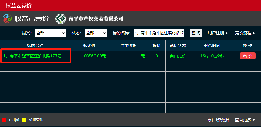 2.打開南平市產(chǎn)權(quán)交易有限公司網(wǎng)站www.jhyigou.com,在網(wǎng)頁中部的競價看板處輸入標(biāo)的名稱擊查詢,點擊標(biāo)的名稱,可以進入該掛牌項目的報名頁面。