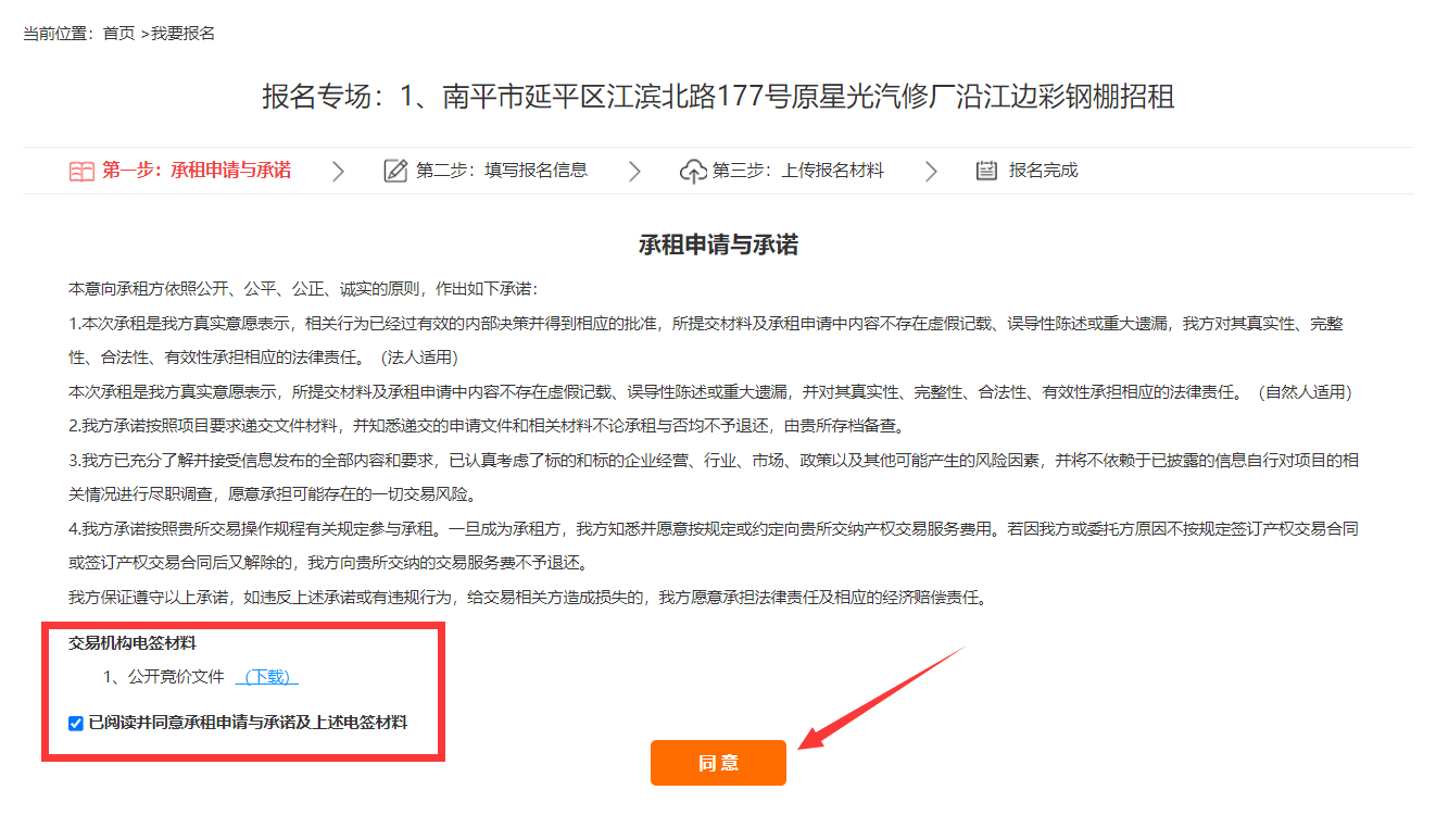 3.點擊“申請競價”,閱讀并同意“承租/受讓申請與承諾”,點擊下載公開競價文件(電簽材料),閱讀并同意電簽的公開競價文件后點擊勾選“已閱讀并同意承租/受讓申請與承諾及上述電簽材料”,點擊“同意”。