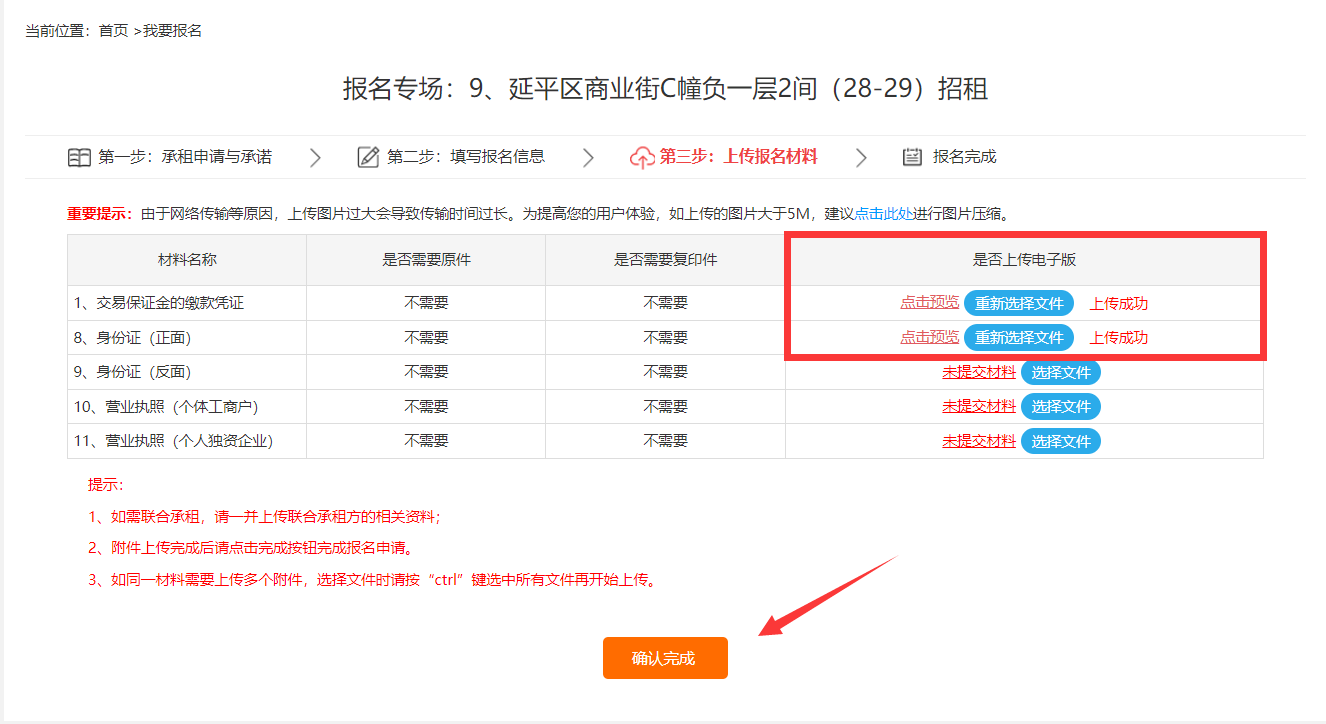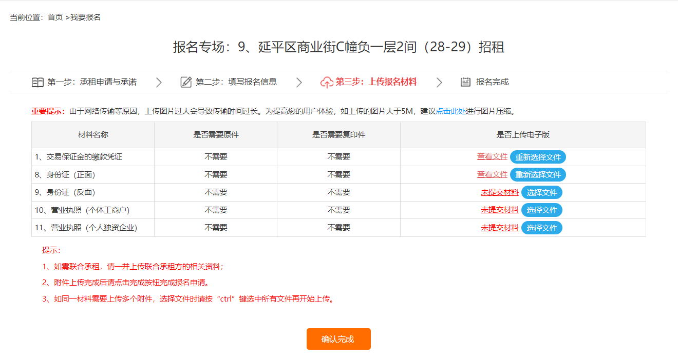 4.上傳電子版本的報名材料,按要求分別上傳各類電子版材料,在上傳成功后,點擊“確認完成”,確認提交競買申請進入下一步。