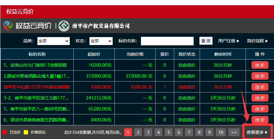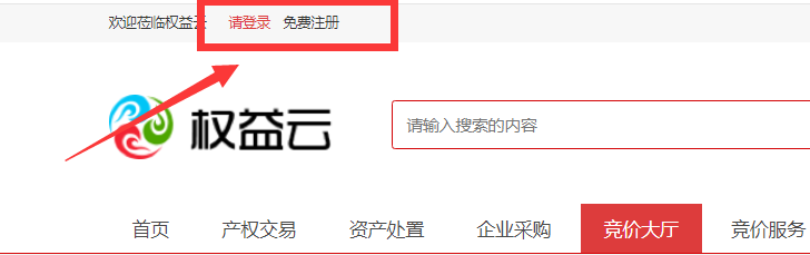 1.打開南平市產(chǎn)權(quán)交易有限公司網(wǎng)站www.jhyigou.com,在網(wǎng)站下部競價看板底部點擊“查看更多”——網(wǎng)頁左上角點擊“請登錄”——登錄權(quán)益云賬號。
